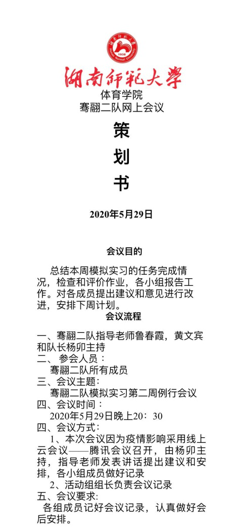 (通讯员 杨卯 吴玉兔 钱婉琴)5月29日晚8:30,为总结本周工作完成情况,安排后续实习工作任务,2017级骞翮二队召开云会议,会议由骞翮二队队长杨卯主持。