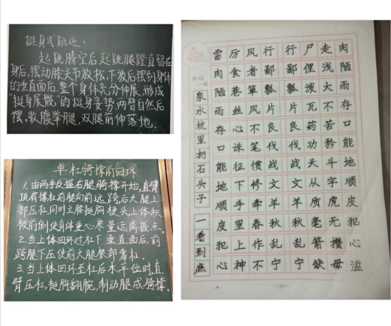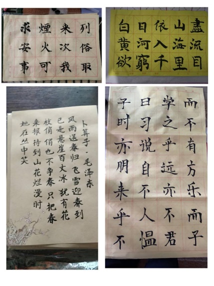 在两位带队老师的指导下,我们首先从基本口令开始了我们每日的打卡。每日学习组会提发布第二天的练习内容,并由纪律组收集全队练习内容,进行打卡考勤。除此之外,我们还进行了粉笔字、钢笔字、毛笔字和普通话三字一话的打卡练习。全体队员要求每日在规定时间内将照片、视频、音频打卡并发至群内,接受检查。