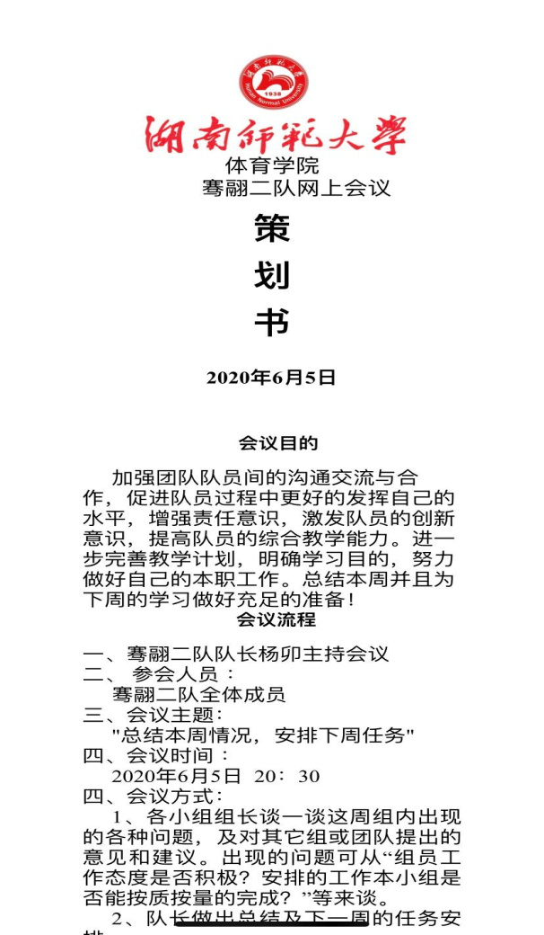 (通讯员 钱婉琴吴玉兔 傅静月)6月5日晚8:30,为总结本周情况,安排下周实习工作任务,2017级骞翮二队召开云会议,会议由骞翮二队队长杨卯主持。