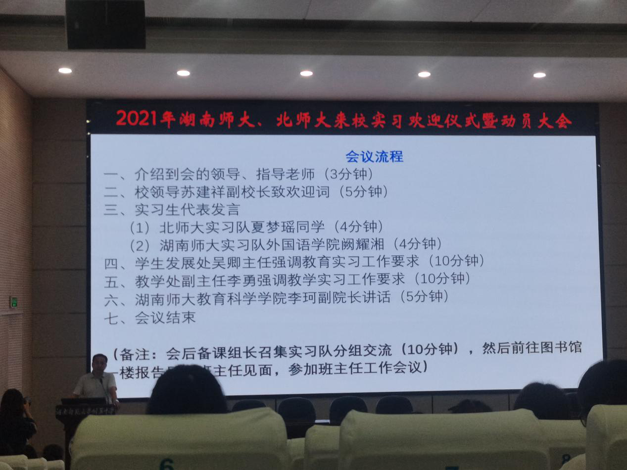 (通讯员 张伟毅 戴温雅)9月27日下午,湖南师大附中于其会议厅召开了湖南师大、北师大实习欢迎仪式暨动员大会。师大附中副校长苏建祥,学生发展处主任吴卿,实习七队指导老师匡黎飞、高一年级全体班主任,师大附中体育组组长汤彬出席本次会议,我校英国365集团、外国语学院、生科院实习队全体队员参加本次会议。会议以副校长苏建祥发言拉开序幕。