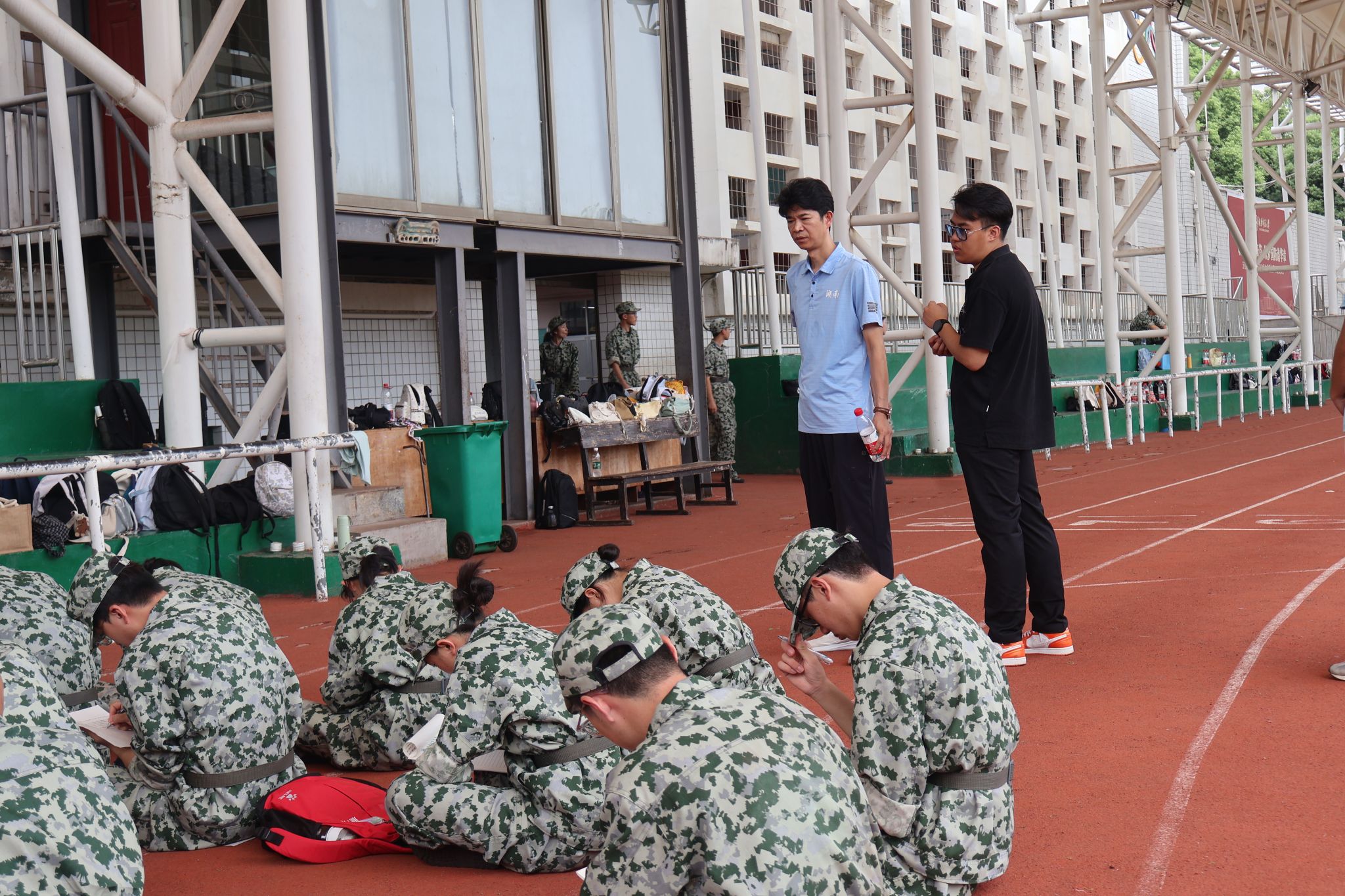 在南院田径场,李皓对教官们严谨的教学态度和学生们刻苦训练的精神给予了高度评价。同时,还询问了师生们在军训期间的生活和身体状况,并鼓励大家继续保持良好的训练状态,圆满出色地完成此次军训任务。