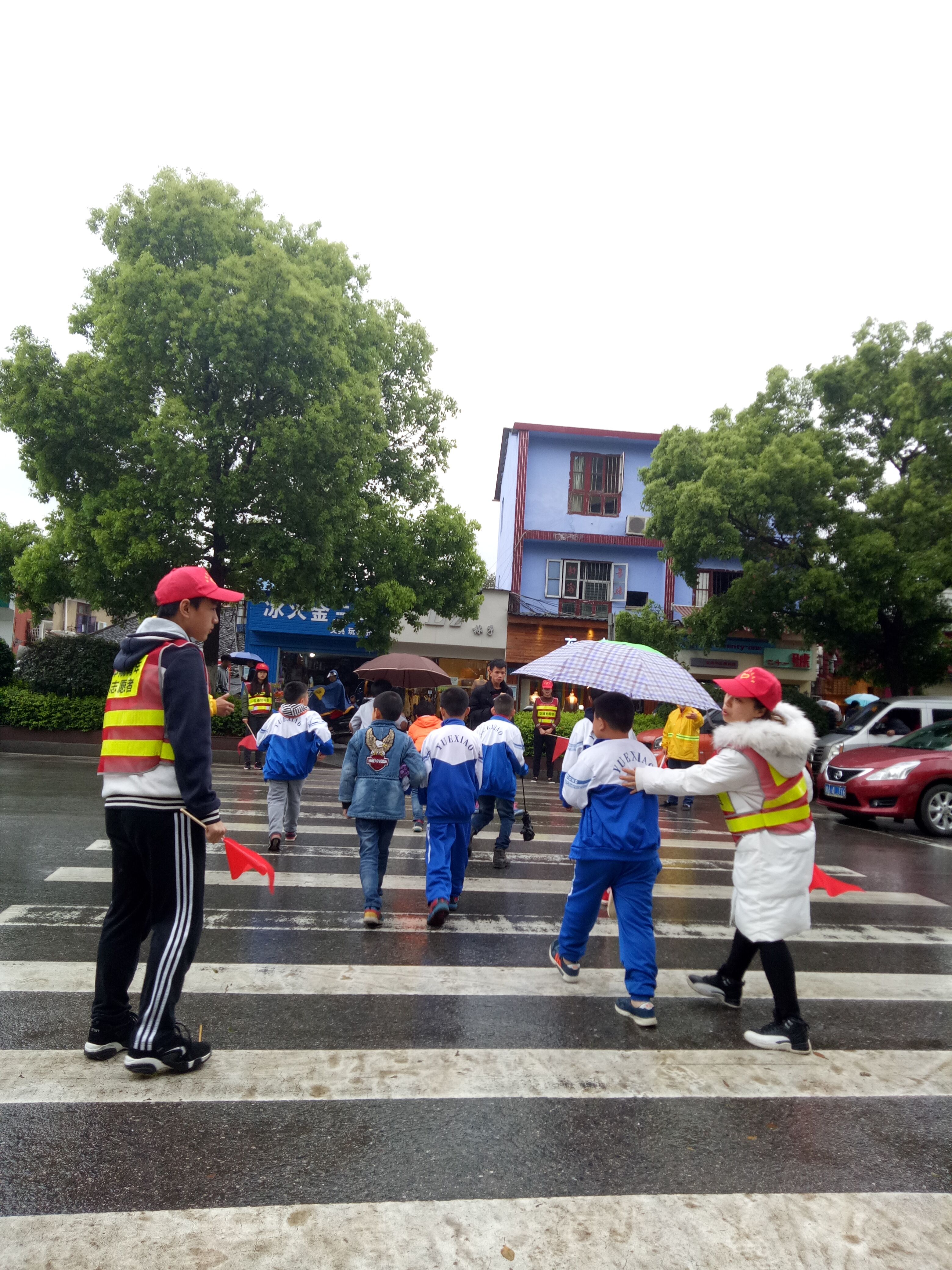 11点30分,冷风中夹杂细雨,我院志愿者按时抵达,迅速戴上红色志愿帽,换上了交通劝导员服装,耐心等待着放学的铃声。