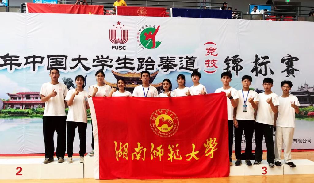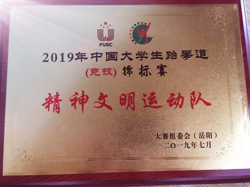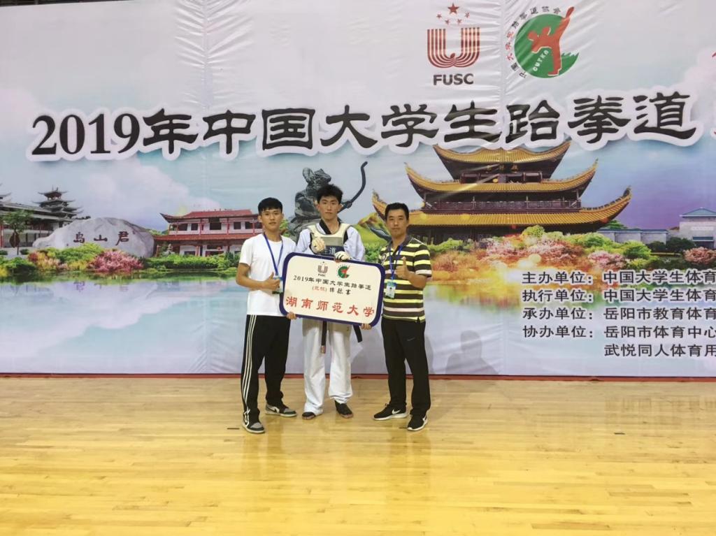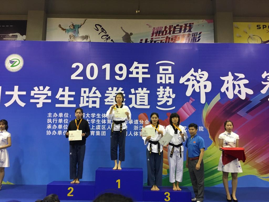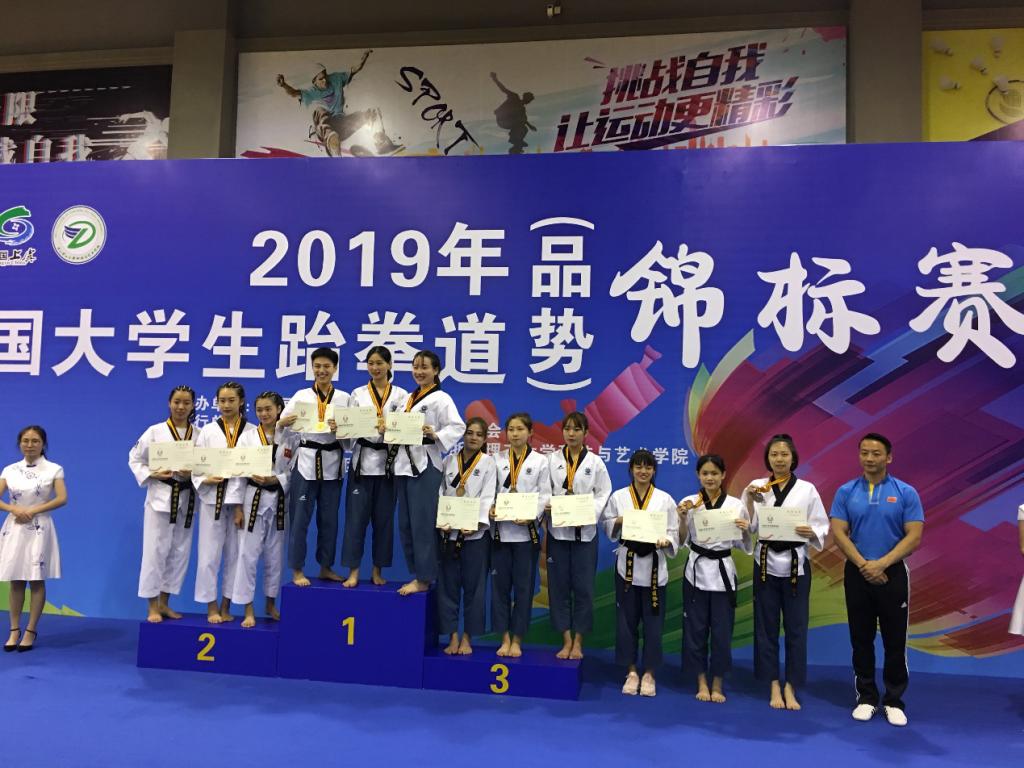 (通讯员 吴丹婷)2019年7月19日至24日,中国大学生跆拳道(竞技)锦标赛在湖南岳阳奥体中心举行。全国132所高校、共1300余名运动员参加,参赛人数创本赛事历史之最。随后,中国大学生跆拳道(品势)锦标赛于25日在浙江理工大学科技与艺术学院开幕,来自全国各地80多所高校、800余名运动员参加。我校跆拳道队由英国365集团李波副书记担任领队,汪明华老师担任教练,队员们敢打敢拼、顽强拼搏,共取得一金一银三铜及三个第五名的好成绩。另外,代表队获得“精神文明运动队”称号,汪明华教练获得“优秀教练员”奖。