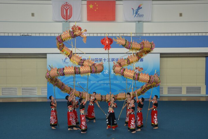 据悉,来自湖南、上海、江苏、重庆、河南、北京、湖北、天津等省市的16支代表队参加了本次舞龙项目决赛。