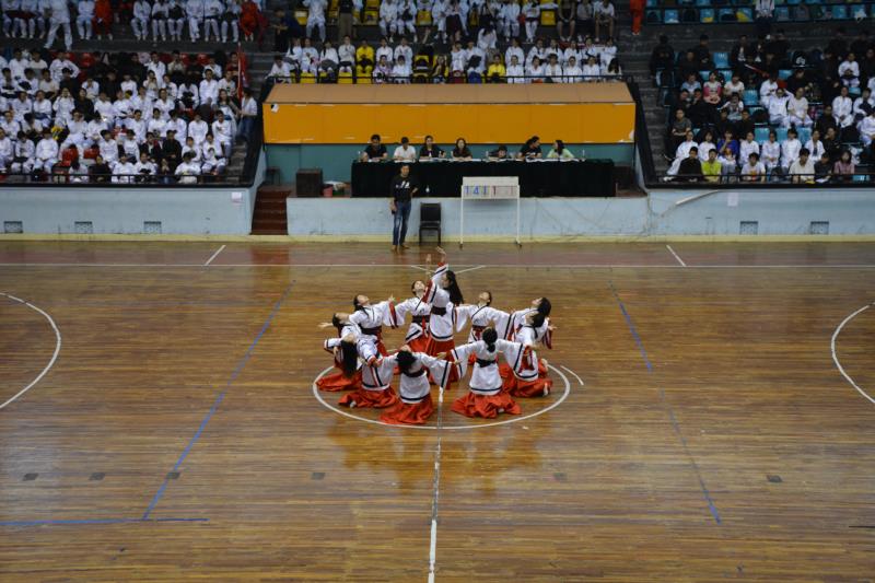 各学院太极拳代表队相继入场,在悠扬的乐曲声中,他们用行动阐述太极意蕴,一招一式尽显仙风道骨,且吟且舞尽显风采,为观众带来了一场视听盛宴。有的学院糅合了京剧的古风舞蹈,摆出了太极八卦阵,配上整齐划一的招式,赢得连连喝彩;有的学院以黑白相间的队列,融会贯通的招式,阐述了“太极生两仪,两仪生四象,四象生八卦,八卦衍万物”的太极真谛;大家行云流水般的动作配上轻缓婉转的曲调,充分展现太极的柔和与韧劲,将太极风骨体现得淋漓尽致。