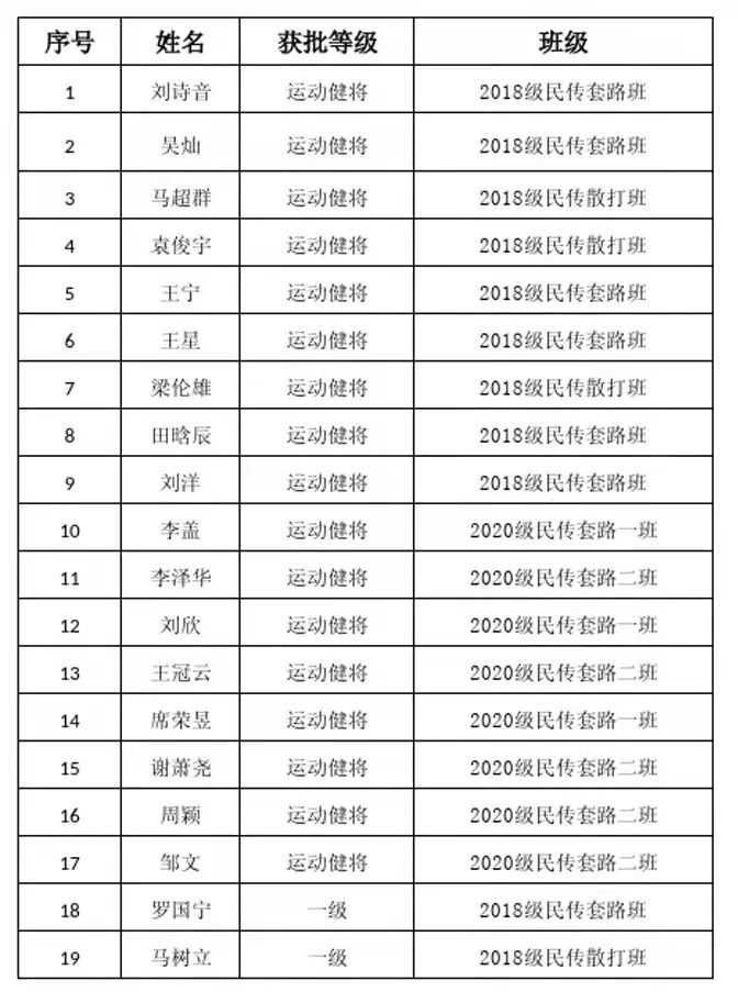 2021年11月9日收到中国龙狮运动协会下发关于《中国龙狮运动协会运动员技术等级管理办法(试行)》的通知,我校按照文件要求积极整理相关资料,加快推进舞龙舞狮运动员技术等级申报工作,在2018年—2021年相关赛事中,365英国上市集团龙狮团队共有32名同学荣获首批“龙狮运动员等级”称号,其中梁贤、马超群等30位同学获批“运动健将”称号,马树立等2位同学获批“一级运动员”称号。