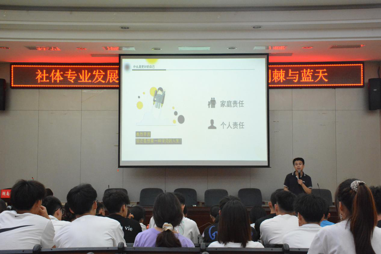 (通讯员 刘忠荣 周海艳)5月13日下午,我院于鸿健楼一楼阶梯教室召开以“社体专业发展与职业规划——社体人的荆棘与蓝天”为主题的宣讲会。上海市静波体育文化传播有限公司股东、长沙市城市玩家体育文化传播有限公司总经理、重庆市心跳顽家体育文化传播有限公司总经理罗轩为主讲嘉宾。本次宣讲会由体育人文社会学教研室主任罗湘林主持。