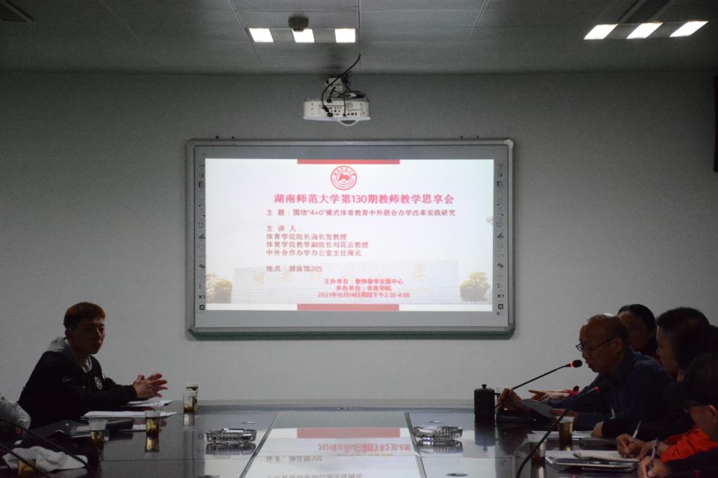 (通讯员 郭小雨 韩籽仪)10月14日下午,我校教师教育学院主办、我院承办的第130期教师教学思享会在我院涵健馆举行。我校教师教育学院教师教学能力发展科科长廖志华出席会议。会议由我院院长汤长发、副院长刘花云、教务办主任胡文烨、行政办副主任周元主讲。我院各教研室主任和中外合作办学任课老师参会。会议由胡文烨担任主持,围绕“4+0”模式体育教育中外联合办学改革实践研究主题展开发言。