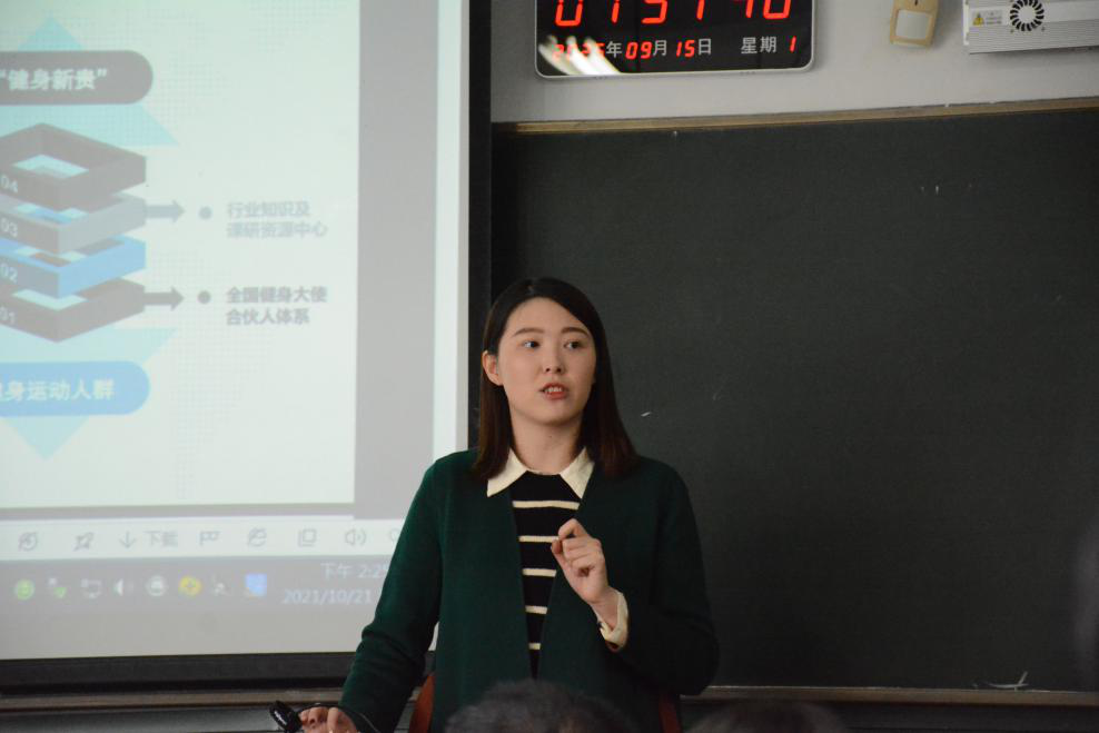 李姝莹分析了社会体育市场环境及健身行业的发展前景,同时分享自己过去六年的成长经历并对其公司业务进行了简单的介绍。她用自己的成长经历告诉大家,要不断地学习、坚守、沉淀,要勇于突破认知边界。随后,同学们积极提出自己的困惑,李姝莹为他们一一解答。