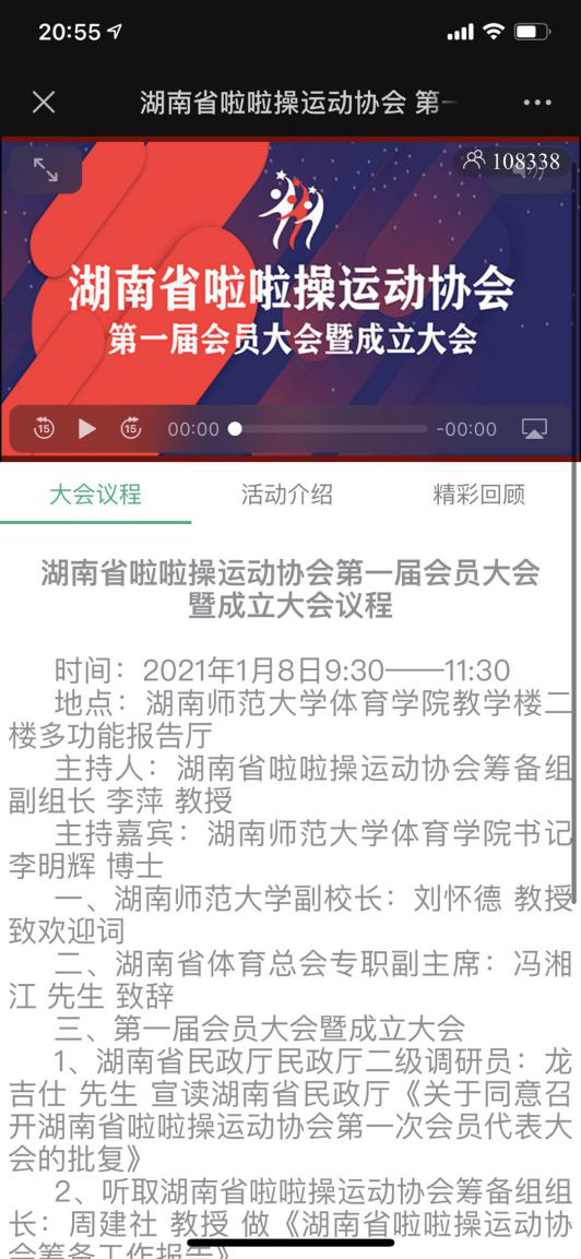 本次会议采用线下会议与线上直播会议同时进行。线下邀请了主席、常务副主席、常务理事、理事候选人,以及单位会员代表到现场参会,其他会员采用观看线上直播的形式参加会议。会议获得了良好的社会反响,关注程度高,观看视频直播的多达109620人次。本次会议获得了湖南嘉通体育文化有限公司、长沙县传媒之星文化艺术培训学校、长沙市子沐文化传播有限公司的赞助与支持。