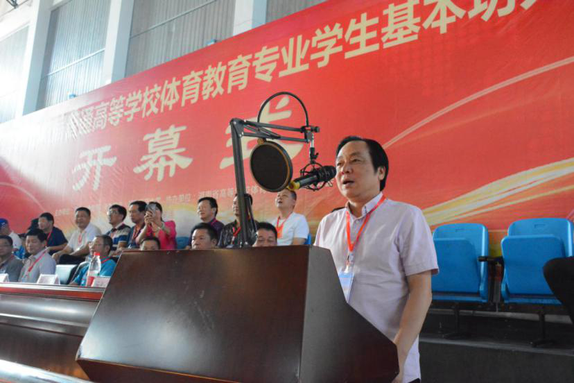 湖南省教育厅体卫艺处处长彭四龙宣布湖南省第五届普通高等学校体育教育专业学生基本功大赛开幕。