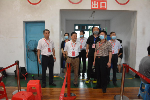 蒋洪新一行深入考试工作现场,逐一视察篮球场、武术馆、田径场、排球场、监控室等场地,查看我院防疫物资储备、设备安全运行、考务工作管理、考生考试流程等工作情况,通晓评分细则及考试流程,详细听取相关负责人的工作汇报。