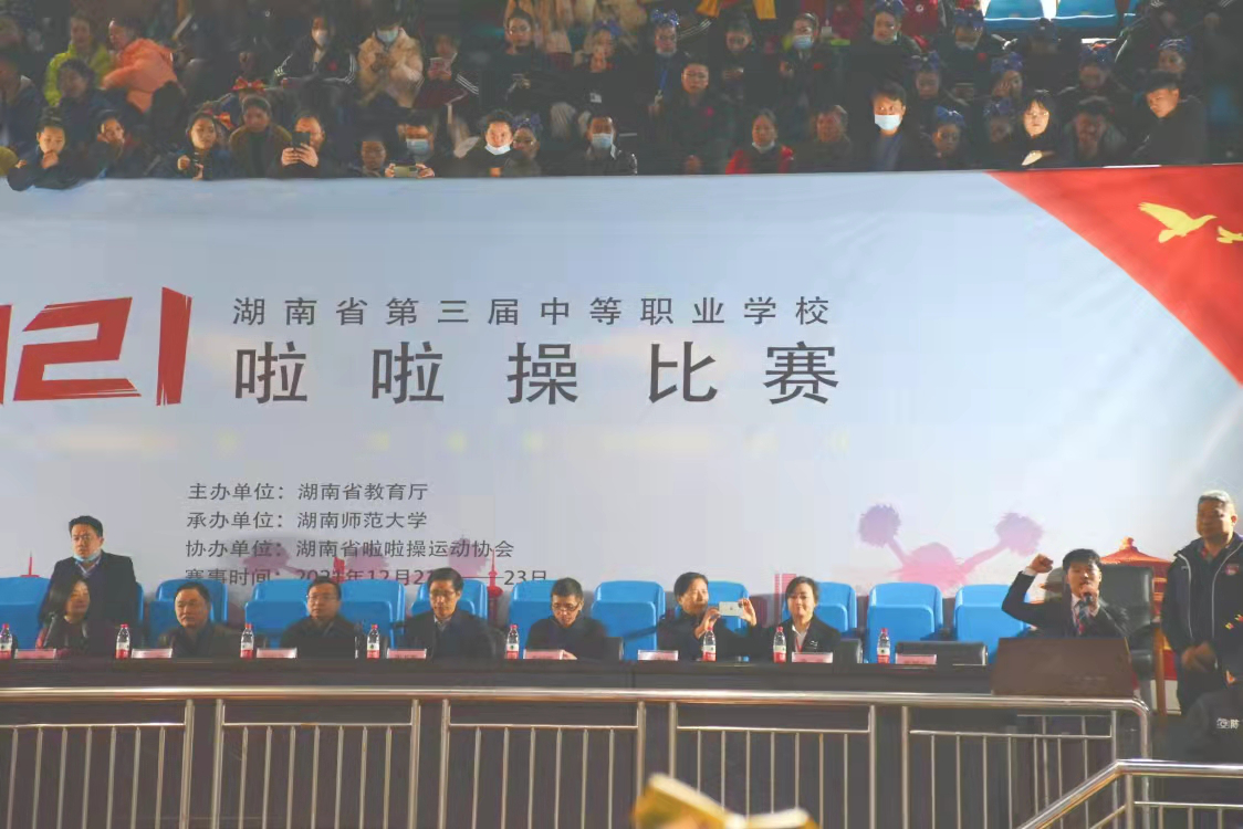 (通讯员 黄杨杨 曾美华)12月22日上午,由湖南省教育厅主办,湖南省啦啦操运动协会协办的第三届中等职业学校啦啦操比赛在我院体育馆主馆隆重举行。我校副校长刘怀德,省教育厅职成处处长崔书芳,省教育厅职成处四级调研员王宇,我院院长汤长发,我院原党委书记李明辉,副院长郭献中,副院长余琳,本次比赛仲裁委员周建社、李艳翎,本届比赛技术代表李先雄,中共湖南省啦啦操运动协会党支部书记周强猛,本届比赛裁判长李萍出席此次开幕式,本次开幕式由郭献中主持。