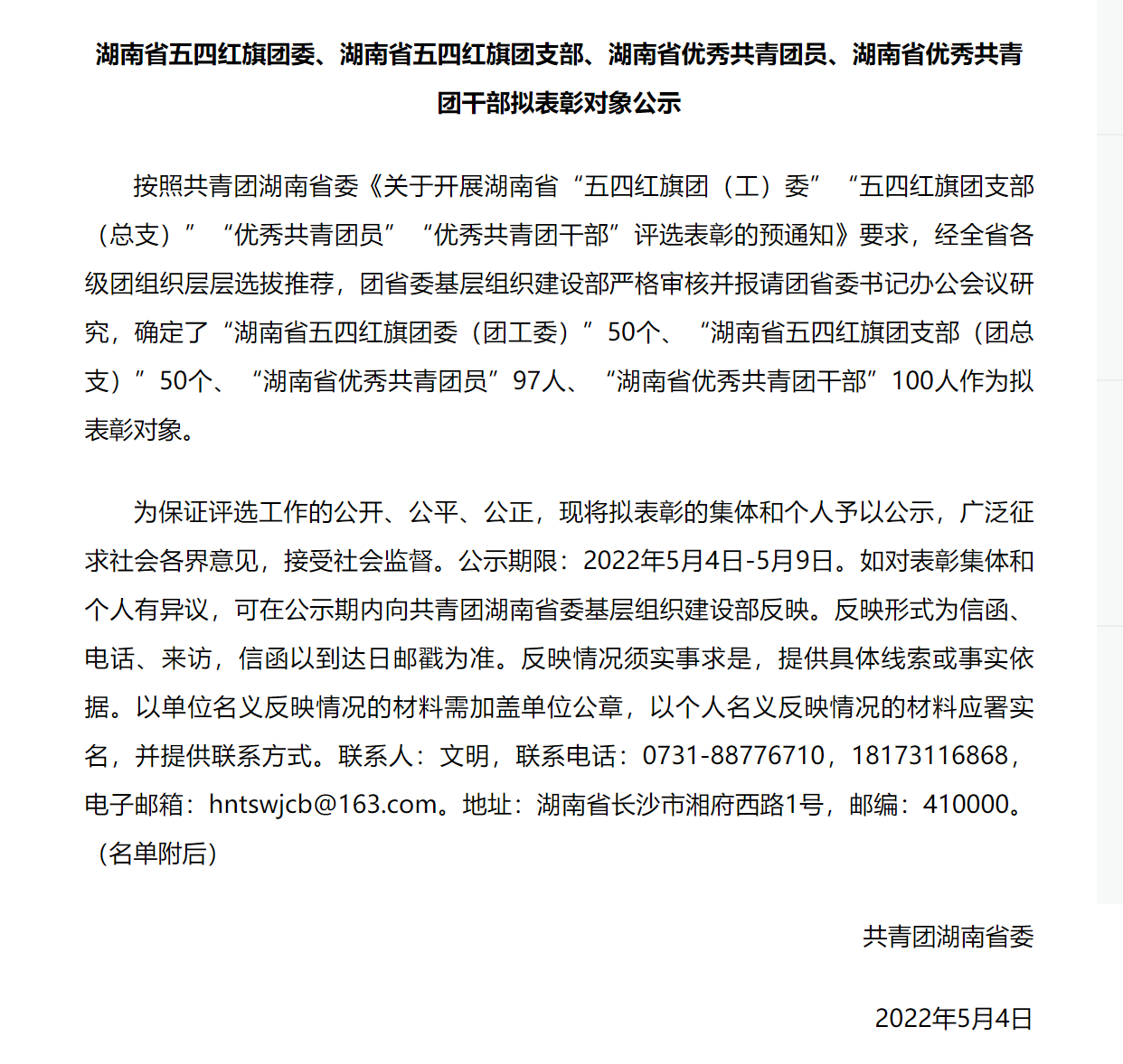 5月4日,共青团湖南省委确定了“湖南省五四红旗团委(团工委)”50个、“湖南省五四红旗团支部(团总支)”50个、“湖南省优秀共青团员”97人、“湖南省优秀共青团干部”100人作为拟表彰对象,并予以公示。