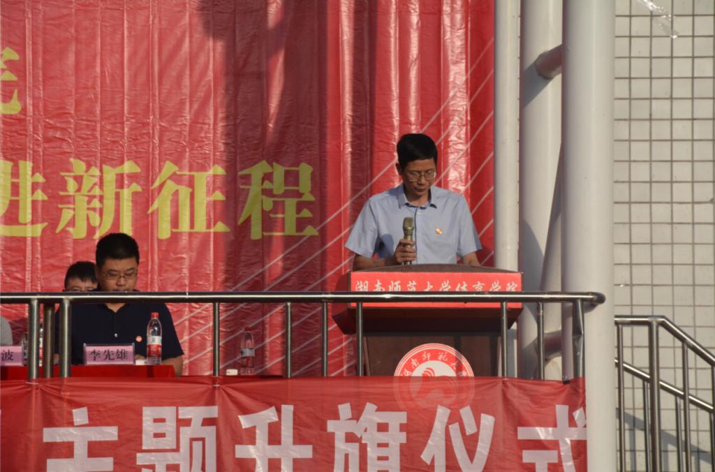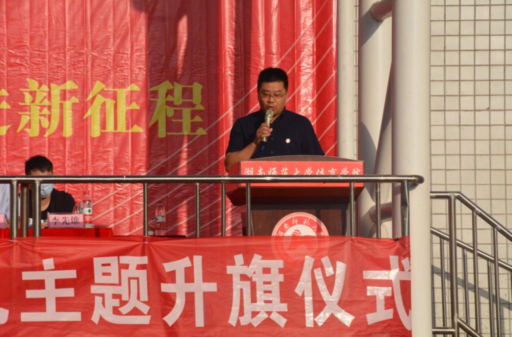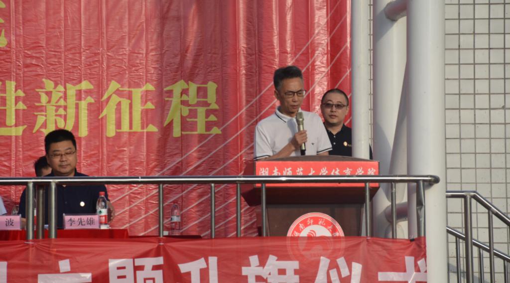英国365集团1996届杰出校友,我校校友会副理事长、长沙市律师协会会长、湖南省律师协会副会长、湖南省政协委员、湖南人和人律师事务所董事会主席江帆致辞,他表示学院的升旗仪式让他想起了26年前自己的大学时光,他表达了对母校及毕业生的衷心祝福,寄语即将毕业的学弟学妹:一要好好珍惜时光,努力学习;二要以真诚之心对待社会,以坚韧之心成就事业,以赤子之心报效祖国;三要牢记初心使命,勇于担当作为,努力彰显新时代新青年的新面貌。