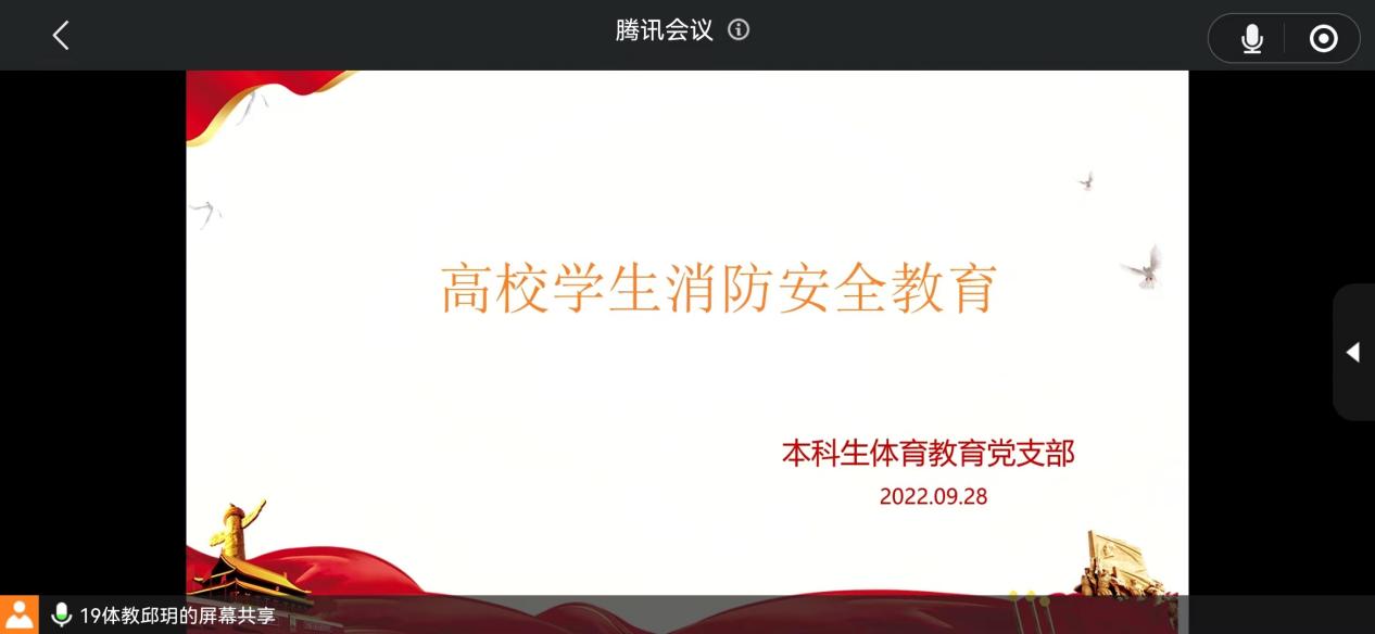 (通讯员 蒋怀韬、张祎函)9月28号晚上,我院本科生体育教育党支部召开线上高校学生消防安全教育,本次会议主要以线上的方式进行,由体育教育学生党支部副书记邱玥主持。