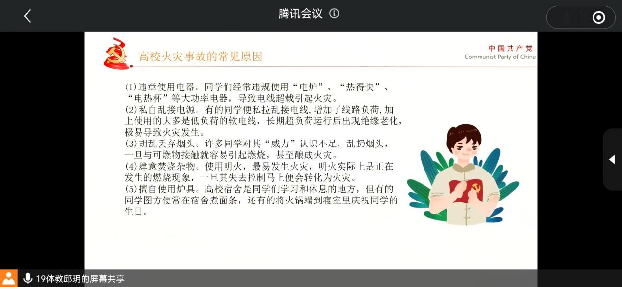 学生党支部副书记邱玥通过PPT展示的方式,向我们讲述了各高校火灾的案例,通过各项案例向我们讲述了各高校火灾事故发生的常见原因,如违规使用高功率电器,私自乱接电源等。并通过视频的方式告诉我们高校各类典型场所的逃生与自救技巧。