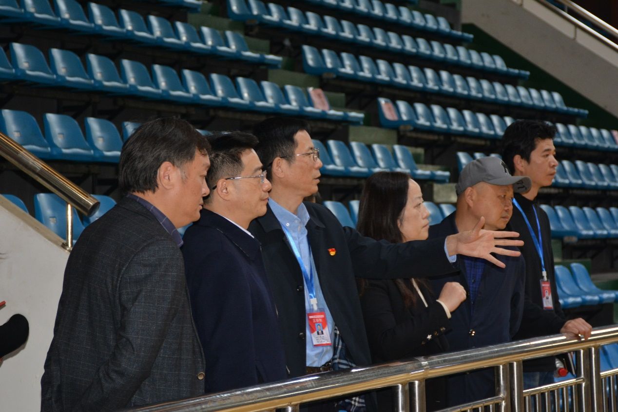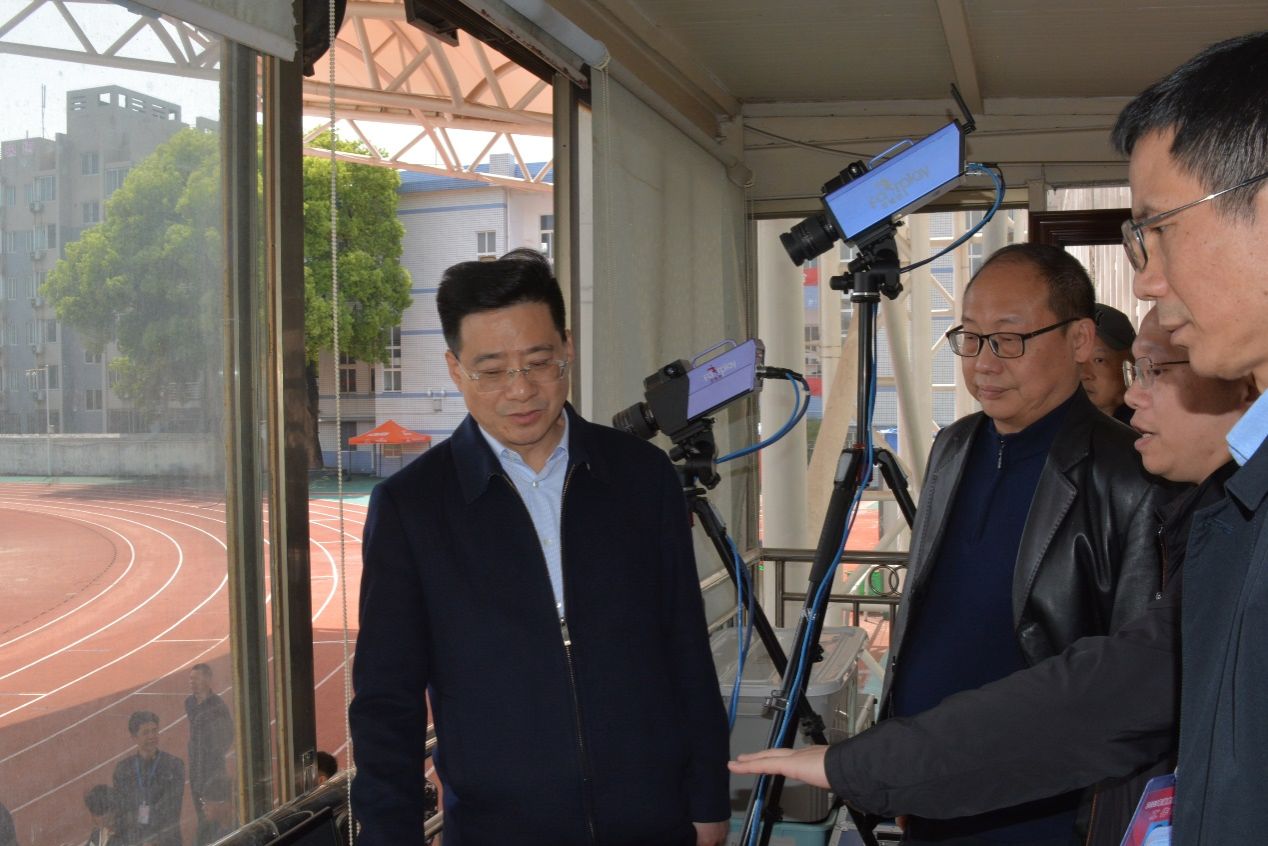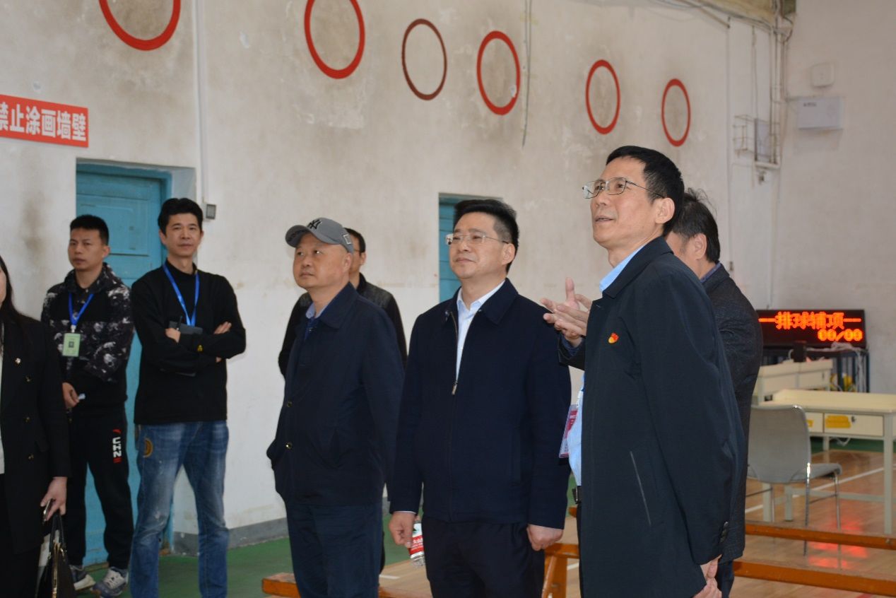 曹文才一行深入考试工作现场,逐一视察排球馆、乒乓球馆、羽毛球馆、排球场、田径馆等考试场地,详细询问了考务负责人关于考场设置、考试流程、安全防控体系等方面的介绍。