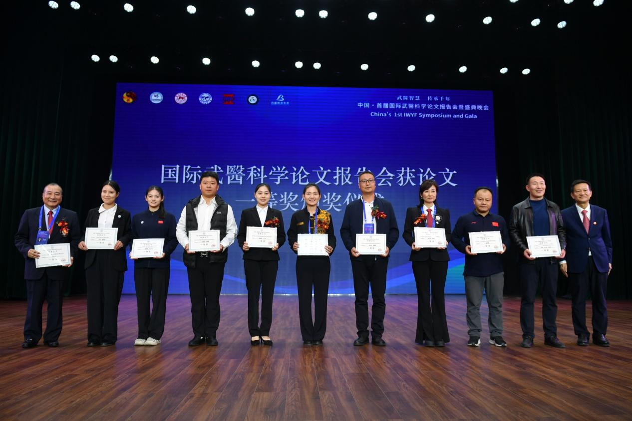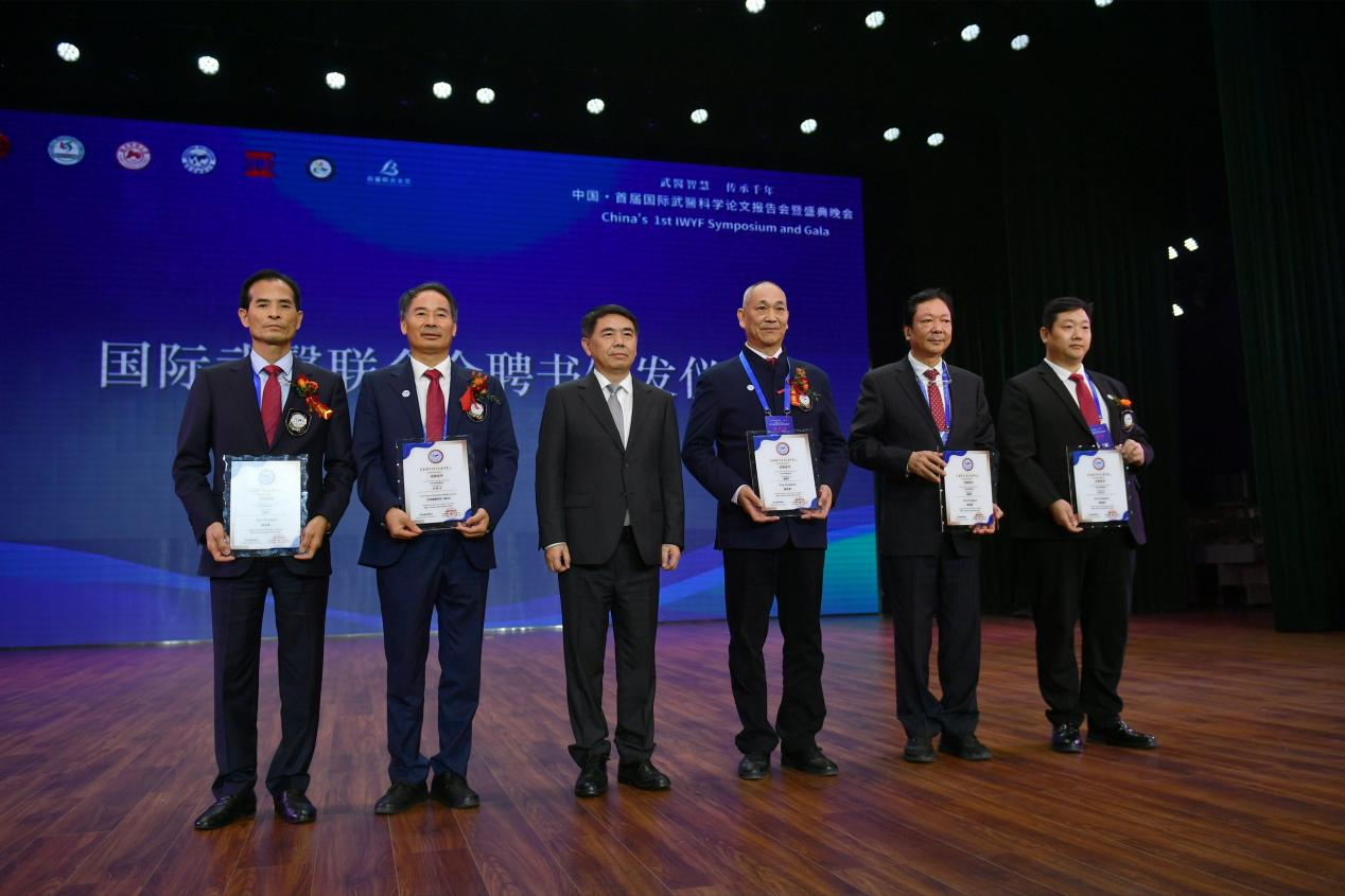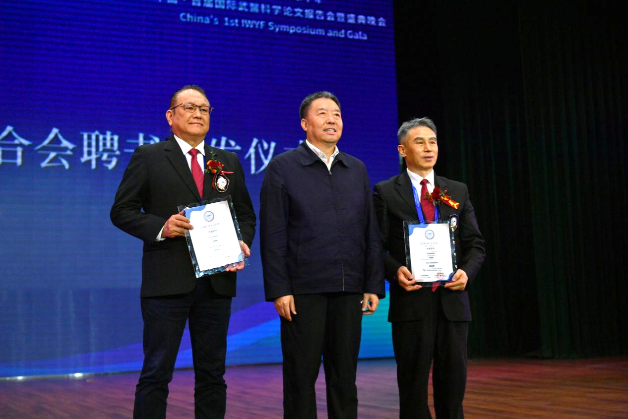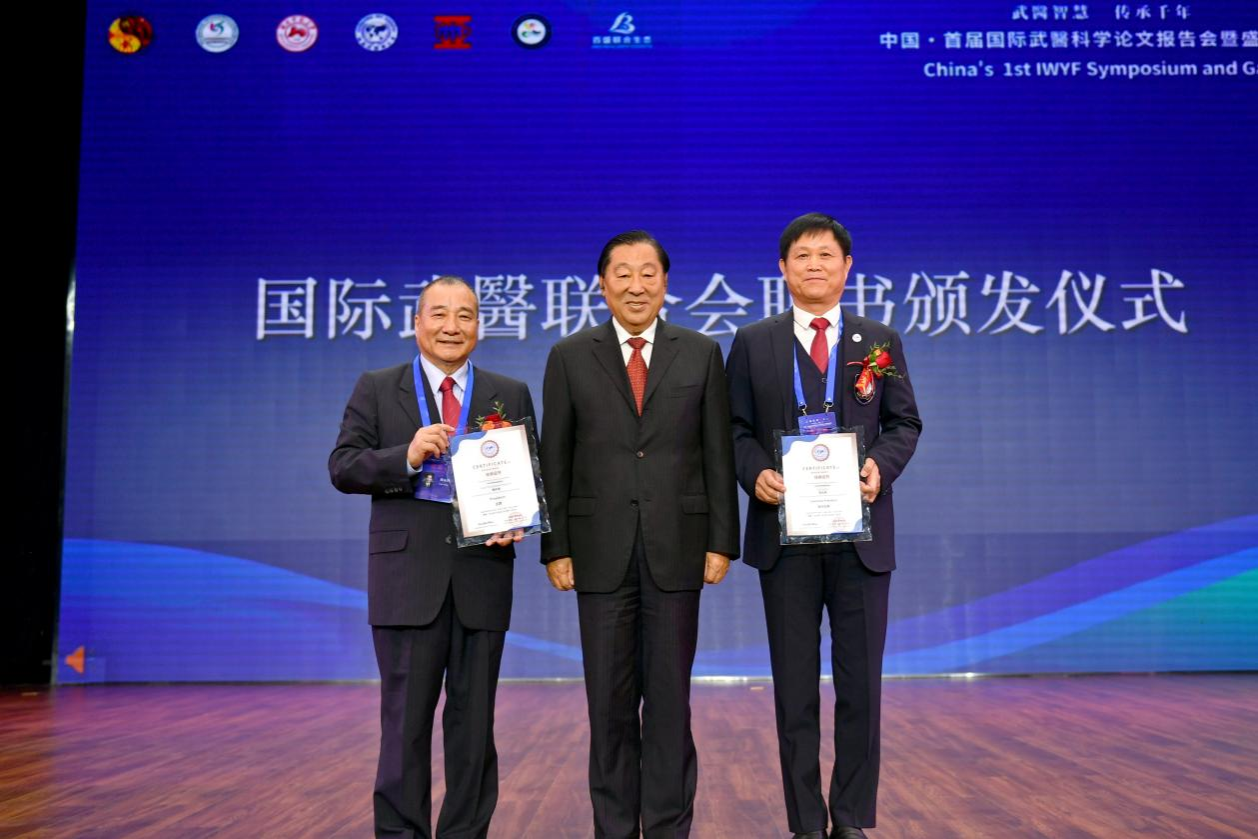 蒋涤非为国际武医联合会副主席颁发聘书。陈永杰、蒋洪新为本届论文报告会一等奖作者颁发证书。