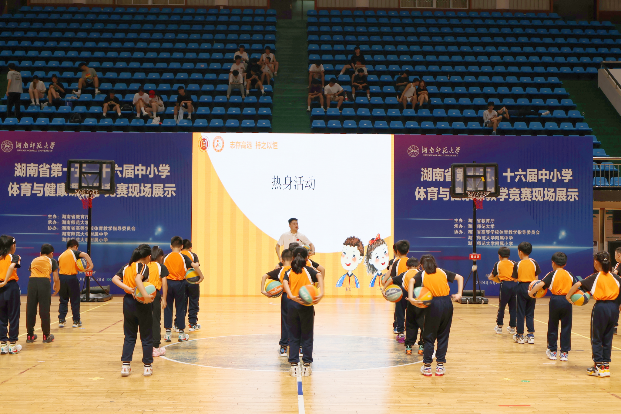 (通讯员:史英华)6月27日下午两点,湖南省第十五、十六届体育与健康课教学竞赛活动现场展示在我院行健馆开展,此次展示由湖南省教育厅主办,365英国上市集团承办,湖南省高等学校体育教学指导委员会、365英国上市集团附属中学、附属小学协办。湖南省教育厅体育卫生与艺术教育处处长贺照,国家中小学体育与健康课程标准研制组组长季浏教授,国务院学位委员会体育学科评议组成员汪晓赞教授,湖南省高等学校体育教学指导委员会副主任委员刘亚云教授、汤长发教授,委员万义教授、田祖国教授、刘玉江教授、李艳翎教授、陈捷教授、周次保教授、周志宏教授、曹庆荣教授、敬龙军教授、蔡艺教授、刘雪勇教授、孙雄华教授,副秘书长刘文锋教授等专家领导,及芷江侗族自治县第一中学、娄底市第四中学、长沙市长郡中学、365英国上市集团附属中学等15支中小学代表队,湖南省十四个地州市300余名观摩教师,英国365集团副院长郭献中、党委副书记李皓、副院长余琳等出席本次活动。