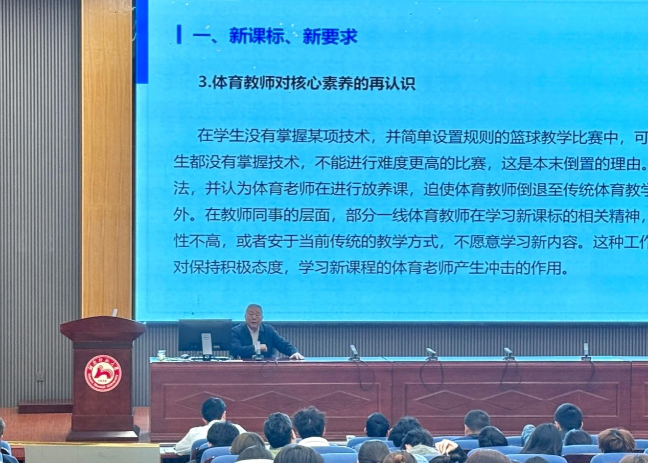 随后,由长沙市一中马王堆中学校长罗立开展主题为“新课标背景下指向核心素养的体育与健康教育”的讲座。他着重强调了体育课前准备中精准设计的关键意义,详细阐述了体育课的四个核心环节,并指出以学生为本的教学方法和手段是提升教学质量的重要途径,鼓励同学们努力成为有根有魂的体育老师,在教学中传递体育精神、塑造学生品格。