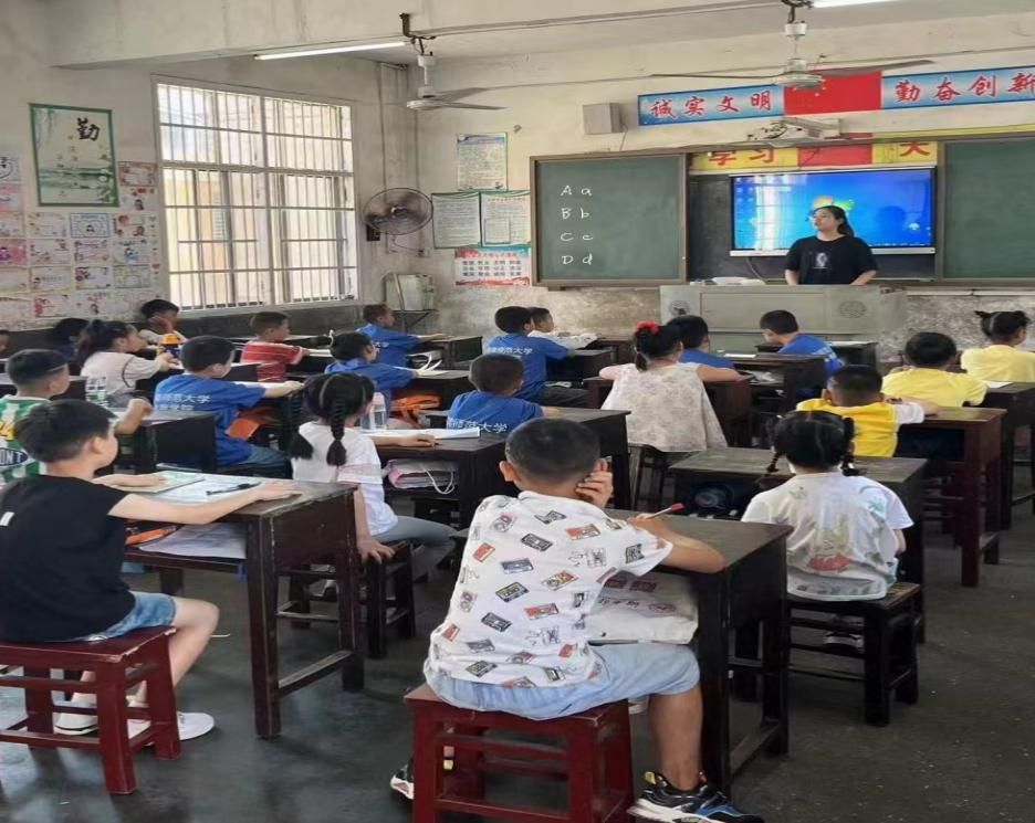 高沙镇中心小学一至三年级的同学们跟着老师学习了英文字母表,乡镇小学三年级开始学习英语。暑期的英文字母教学可以起到启蒙作用,打好学生们的英语基础,使学生获得学习英语的信心。