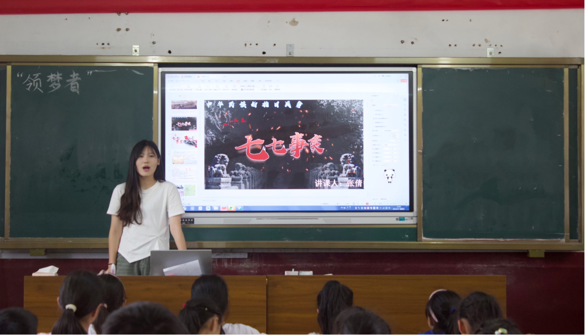 实践团队员张倩作为今日爱国主义教育课程的主讲人,给学生们讲述“七七事变”的历史背景,让学生正确认识“七七事变”的历史意义,传承中华民族抗日战争伟大精神,让学生铭记抗战历史,牢记抗战精神,不忘惨痛教训,缅怀英雄先烈,培养学生奋勇拼搏、热爱祖国的精神品质,激励学生肩负责任,积极进取,发愤图强、开创未来。