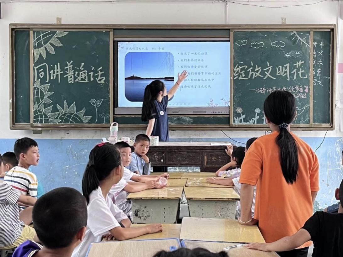 实践团成员带领学生共唱红歌,通过唱红歌的方式,在规范普通话的同时,唤起同学们的红色记忆,培养爱国情怀,继承和弘扬红色精神。孩子们积极学习,热情合唱。童语唱同音,推普筑未来。以青春之歌,唱响文明之花。