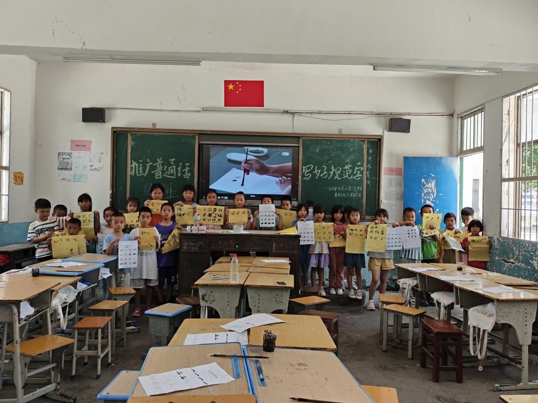 实践团采用书法课的形式,帮助孩子们写出更好的规范字。实践团成员介绍了汉字的起源、发展以及书法的基本概念。同时,向孩子们示范如何写好汉字和基本笔画。讲解并展示“按、压、勾、抵、挡”五步握笔的手法,指导孩子们操作。课堂上,学生对毛笔写字这一新鲜事物很感兴趣,都跟着老师的讲解在纸上认真的写着。课后合影时,同学们手持自己的作品也十分开心。通过课堂教学,孩子们在体验书法的同时,感受了汉字的深厚底蕴,书写能力也明显提升。