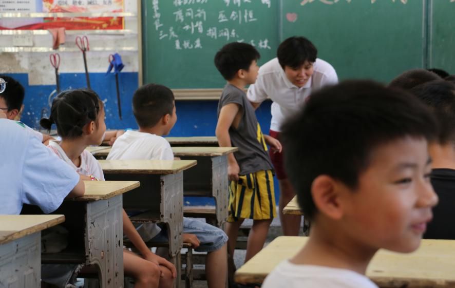 (图为致知力行社会实践团成员蒋盼盼近距离与学生交流)