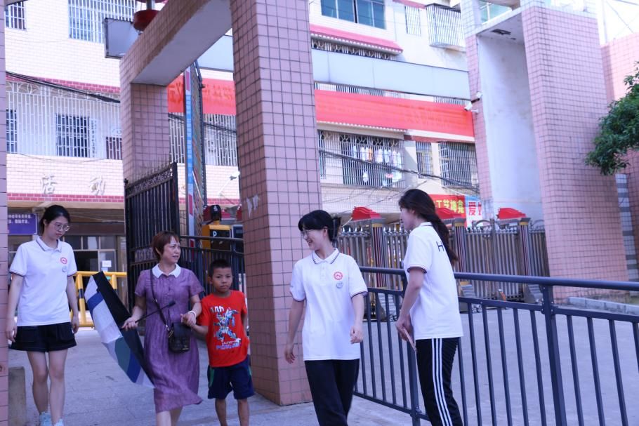 (图为致知力行实践团成员黎珍奇、傅雨晴、郝洪乾迎接前来报道的班级成员及家长)
