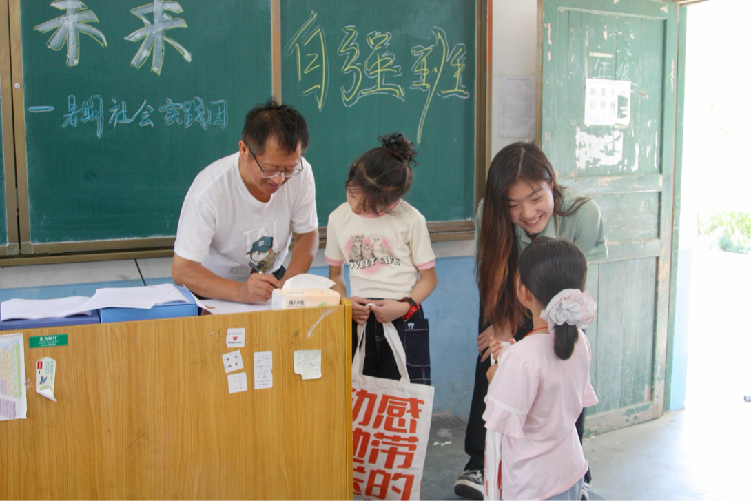 图为实践团队长在给学生分发礼品袋梁艺萱供图