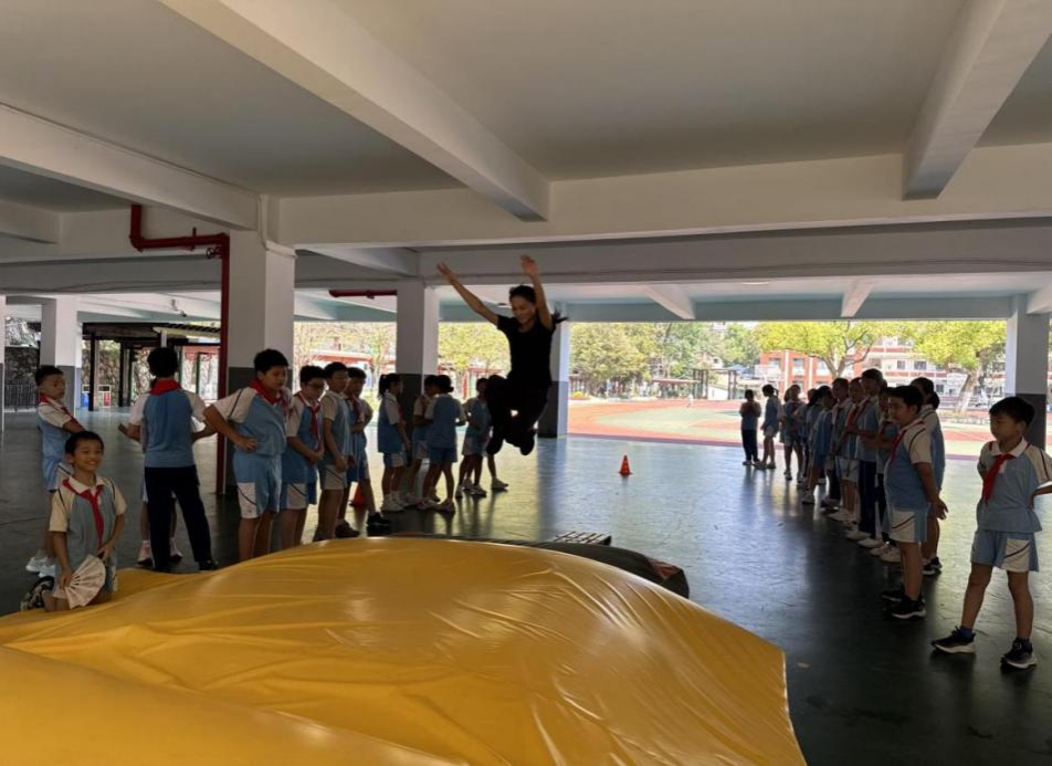 小学部课堂上,实习队员们教态认真,与学生互动积极,聚焦体育技能教学,在课堂上开展助跑跳远专项训练。通过分解示范助跑节奏、起跳角度、落地缓冲等动作要领,帮助学生掌握技术规范。课堂采用分组练习与纠错指导相结合的方式,学生参与积极性高,运动技能得到有效提升。