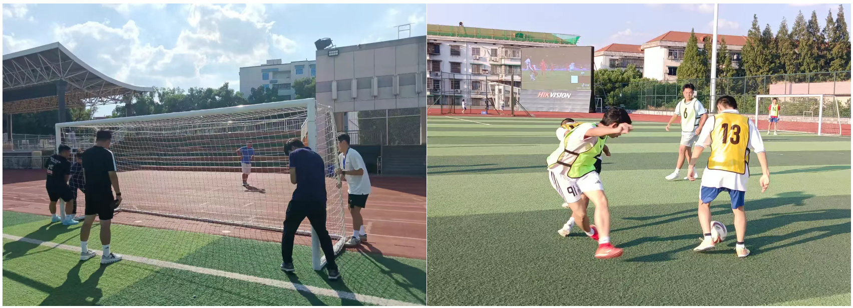 赛前,队员们齐心协力整理场地器材,划分比赛区域,确保赛场安全规范。室外足球场上,学生们热情高涨,享受运动快乐。